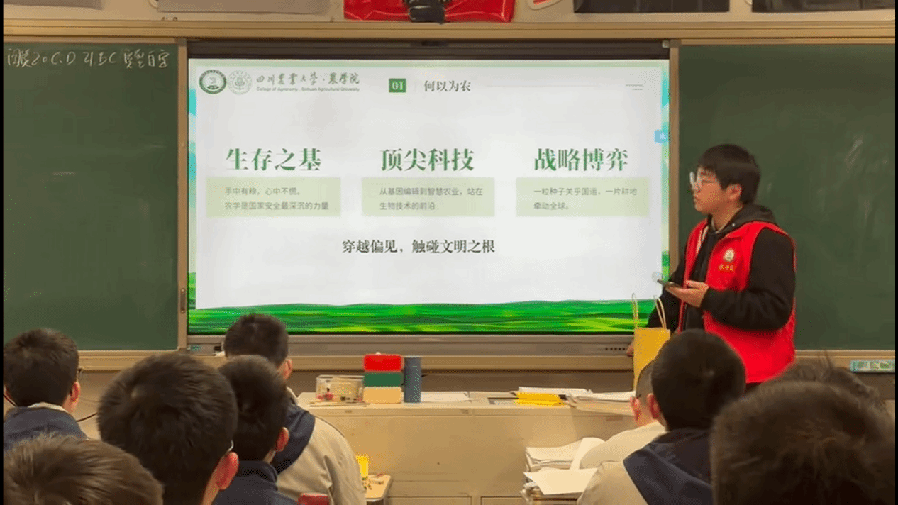 宣讲中,团队成员结合自身专业学习与科研实践经历,通过图文展示、互动问答等形式,生动讲解现代农业科技前沿进展、涉农专业体系内涵与广阔职业前景。内容覆盖智慧农业、作物科学、食品工程、乡村规划、农业资源与环境等前沿方向,清晰展现现代农业已突破传统耕种模式,深度融合生物技术、信息技术、工程技术与管理科学,形成跨学科、创新型发展格局。