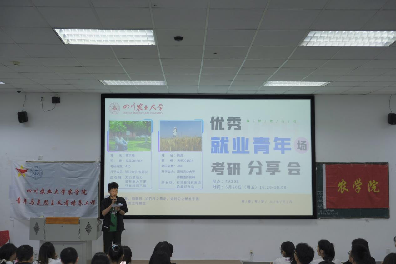 为庆祝中国共产主义青年团成立100周年,加强对广大青年团员的思想政治引领,农学院充分发掘优秀青年学生的典型事迹,积极开展“青春向党”优秀青年事迹进校园系列活动,激励农学院学子向优秀青年靠近。5月20日16时,系列活动第一场——优秀青年就业分享会在4A208顺利开展。农学1802班杨培榆和农学1805班陈潇受邀为大家分享考研经验。