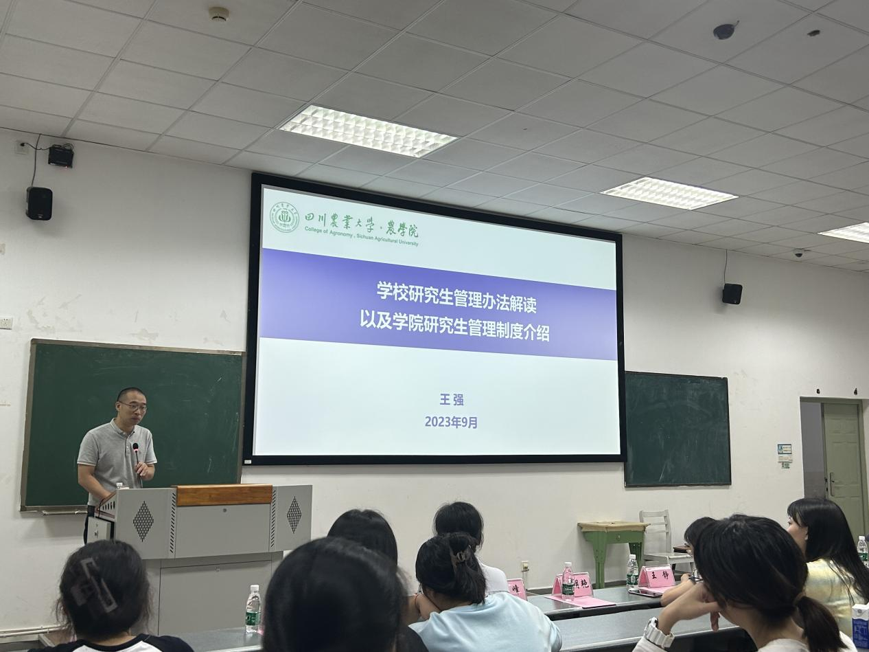 王静首先代表学院全体师生向2023级新生表示热烈的欢迎与诚挚的祝贺,并向同学们介绍了学院的基本情况和学科发展概况,同时提出殷切期望,希望同学们肩负起强农兴农的使命担当,在新时代、新征程做出新的更大贡献。王强详细解读了学校颁布的《研究生管理制度》、《研究生培养方案》以及学院的相关研究生管理事项,并着重强调了研究生培养阶段的关键点和注意事项。杨峰围绕科研平台与基地情况以及实验室安全教育的内容做了详细的介绍,嘱咐同学们进行实验的首要条件是安全,希望同学们科研用心,实验用心,安全放心。黎明艳讲解了学科历史以及文化传承,通过例举优秀校友的事迹生动形象地阐释了川农大精神的内涵,向同学们提出了继承、发扬川农大精神的要求和期盼。