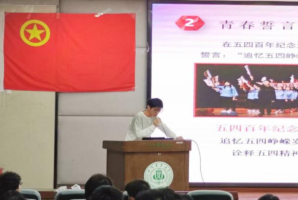 获“五四红旗团支部标兵”称号的国贸202101班团支部代表李婧瑶分享他们的故事。她介绍,班级以“厚德载物、实事求是、守正创新”为班风内核,班团干部率先垂范,凝聚集体力量。随后,四名青年学子演唱校团委原创快闪歌曲《百年传薪火川农正青春》,展现新时代青年朝气与活力。