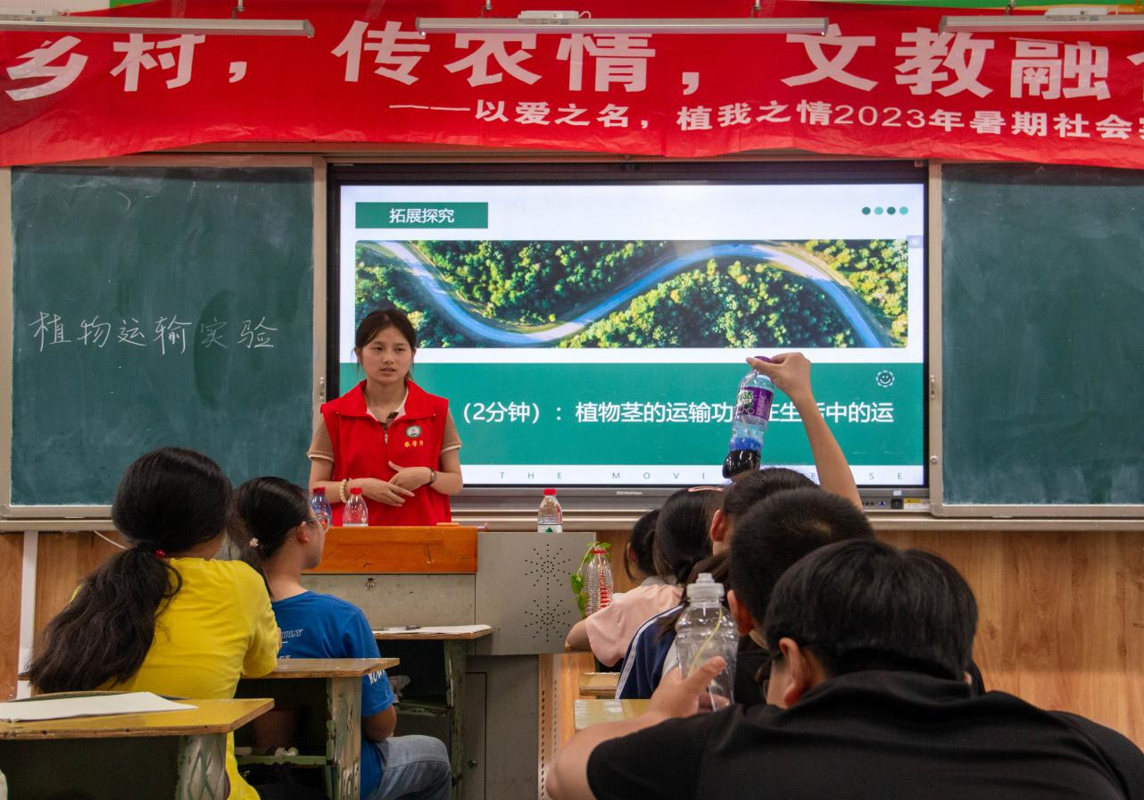 图为支教队员邓钡钡进行植物运输实验理论课的讲解