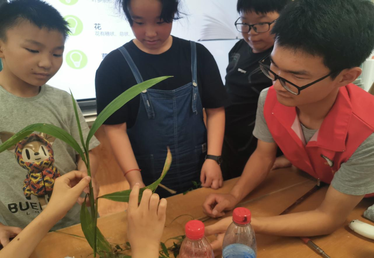 图为支教队员王啸天在课后帮助同学们分析禾本科草的特征
