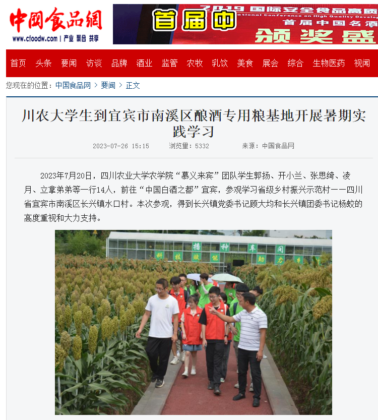 2023年7月20日,ok138cn太阳集团529农学院“慕义来宾”团队学生郭扬、开小兰、张思绮、凌月、立拿弟弟等一行14人,前往“中国白酒之都”宜宾,参观学习省级乡村振兴示范村——四川省宜宾市南溪区长兴镇水口村。本次参观,得到长兴镇党委书记顾大均和长兴镇团委书记杨蛟的高度重视和大力支持。