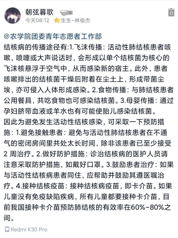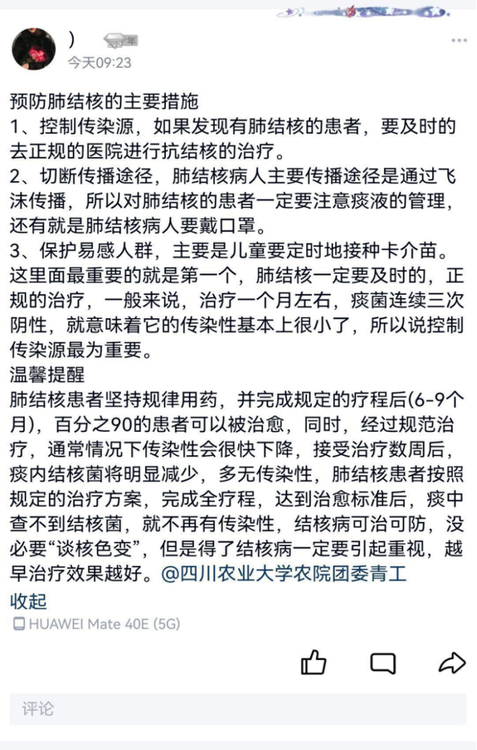 当有报名成功但一直还未加入群聊的同学时,青工的志愿者耐心地在报名群里寻找,引导同学进群。对于志愿者们的辛勤工作,同学们也纷纷表示感谢。在活动群中,同学们畅所欲言自己对肺结核疾病及防治肺结核日的认识。有的同学以自己的亲属为例,讲述了肺结核疾病对自己生活的影响;有的同学用自己的真实经历警示大家肺结核的危害是何其之大。在群聊中,同学们对肺结核疾病有了更深刻的印象和认识,并积极地完成了打卡任务。在最后一天的答题活动中,同学们的表现都十分出色,交出了一份完美的答卷,也为这次宣传活动划上了一个圆满的句号。