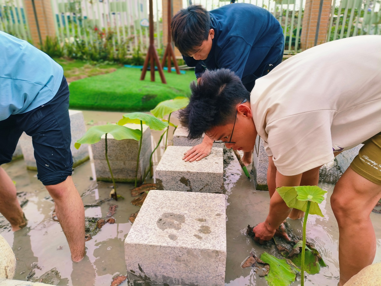 在插秧手法教学结束后小朋友们也相继来到了田地中进行插秧实践,分秧、俯身、插秧、起身“好累哦,腰好酸,农民伯伯真的好辛苦!”在重复了几轮插秧动作后,一位小朋友说道。“我们吃的每一粒粮食都是这样俯腰垂首,一步步,一株株育苗插秧种出来的,大家现在就为我们的粮食存储贡献了自己的一份力量,非常棒!”志愿者张紫柔见小朋友们疲惫后开始鼓励大家,其他志愿者也相继开始了剩余水稻田地的插秧工作。