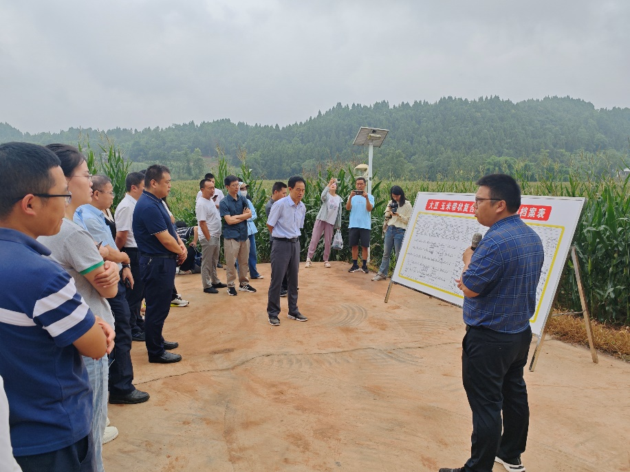 在我校与安居区农业农村局、奉光荣家庭农场共建的“大豆玉米带状复合种植”基地,雍太文结合摆放在地头展架上的种子、药剂、播种机、收获机等实物,从播种到化控、从施肥到收获,向全体参会代表详细讲解了大豆玉米带状复合种植所涉及的农资农机及操作使用要点。针对生产上存在的大豆苗期病虫害多发问题,结合参与的“南方多作大豆全程绿色防控技术体系集成示范”国家重点研发计划课题,常小丽重点围绕大豆种子拌种、田间绿色防控等技术进行了讲解。