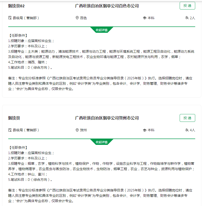 广西壮族自治区烟草专卖局(公司)2025年度高校毕业生招聘公告_国家烟草专卖局 http://www.tobacco.gov.cn/gjyc/zpxx/202502/b423a4f7d20c492c88c01c2958a5e53f.shtml