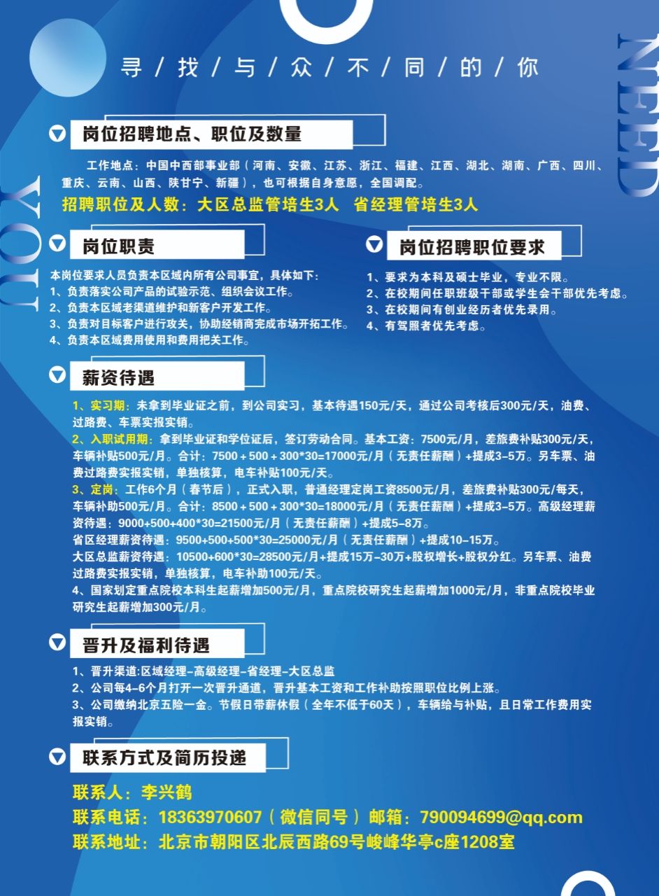 岗位要求:本科及研究生,专业不限。有学生组织干部经历、创业经历、销售经历、项目负责人经历、管理经历等经历的学生优先