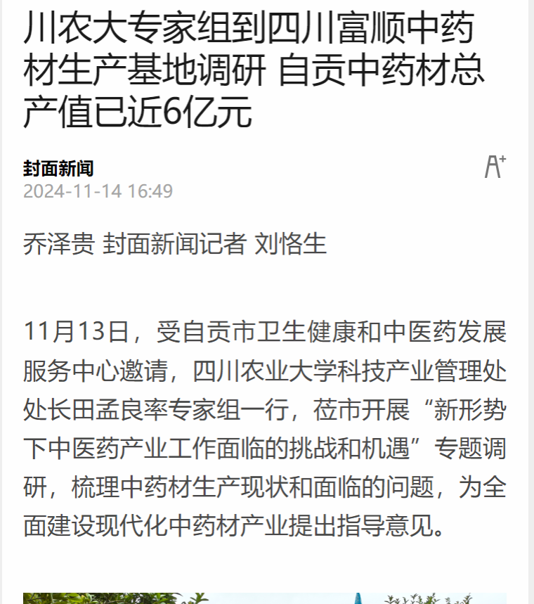 11月13日,受自贡市卫生健康和中医药发展服务中心邀请,ok138cn太阳集团529科技产业管理处处长田孟良率专家组一行,莅市开展“新形势下中医药产业工作面临的挑战和机遇”专题调研,梳理中药材生产现状和面临的问题,为全面建设现代化中药材产业提出指导意见。