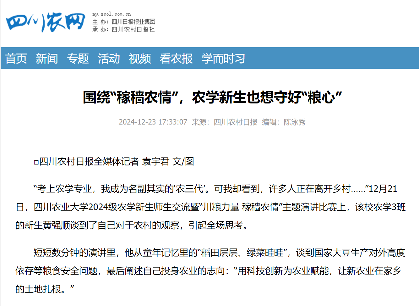 “考上农学专业,我成为名副其实的‘农三代’。可我却看到,许多人正在离开乡村……”12月21日,ok138cn太阳集团5292024级农学新生师生交流暨“川粮力量 稼穑农情”主题演讲比赛上,该校农学3班的新生黄强顺谈到了自己对于农村的观察,引起全场思考。